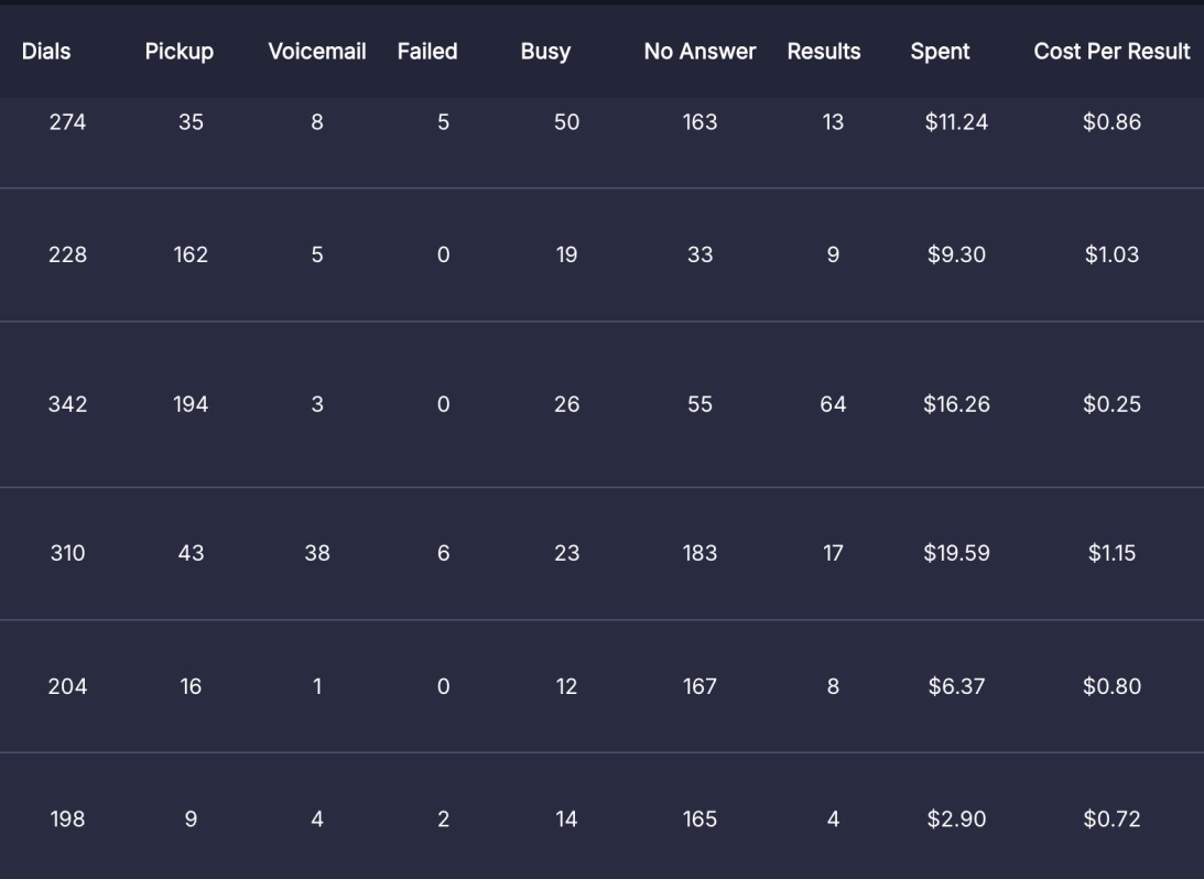 - Voicemails Left: 38 calls reached a voicemail system (answering machine). The AI left the preset voicemail message on those.