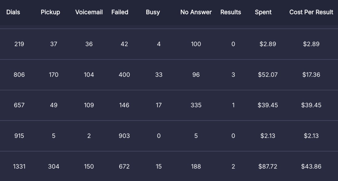 Despite the modest conversion percentage (which is expected in cold outreach), the efficiency of this AI-driven campaign stands out. In a short time, the automated agent engaged 170 prospects in conversation – something that would have required many hours of calling if done manually. Each of the 3 booked consultations represents a highly interested lead that could turn into a new client for the agency. Importantly, these results were achieved for just $52, meaning the agency paid only around $17 for each solid sales meeting on the calendar.