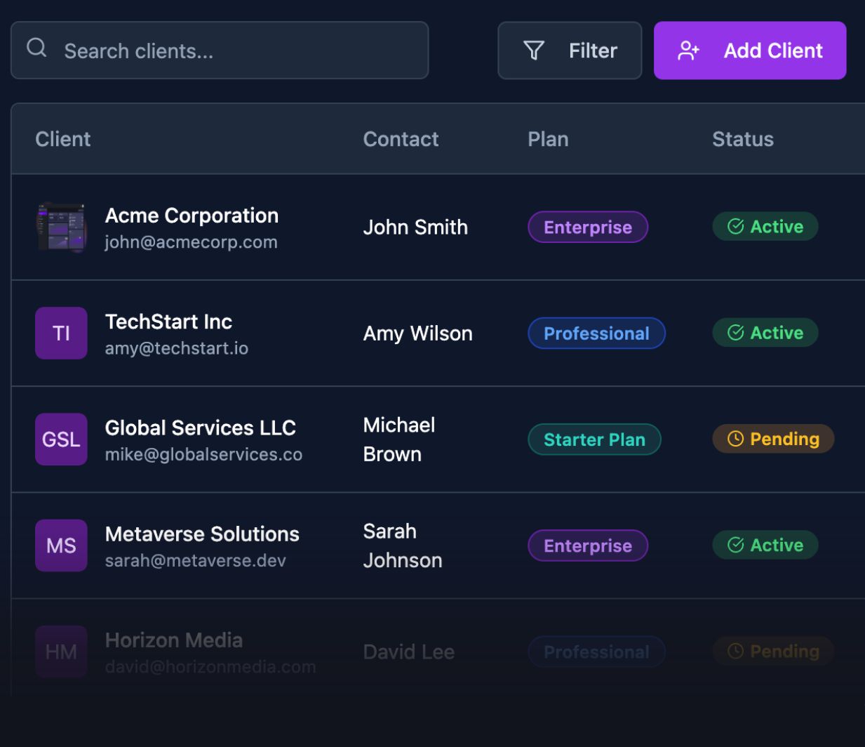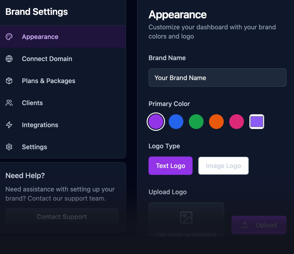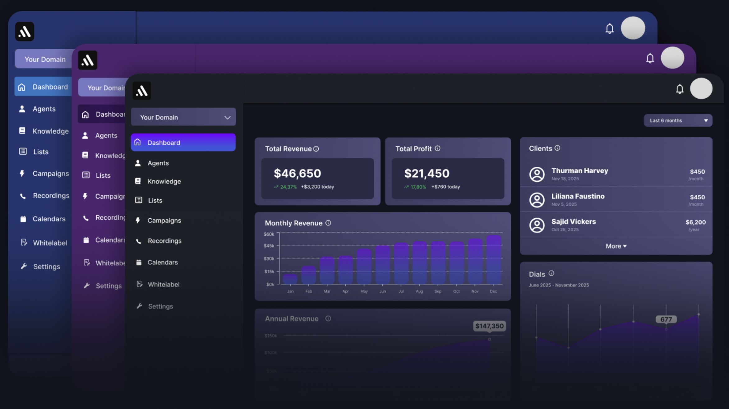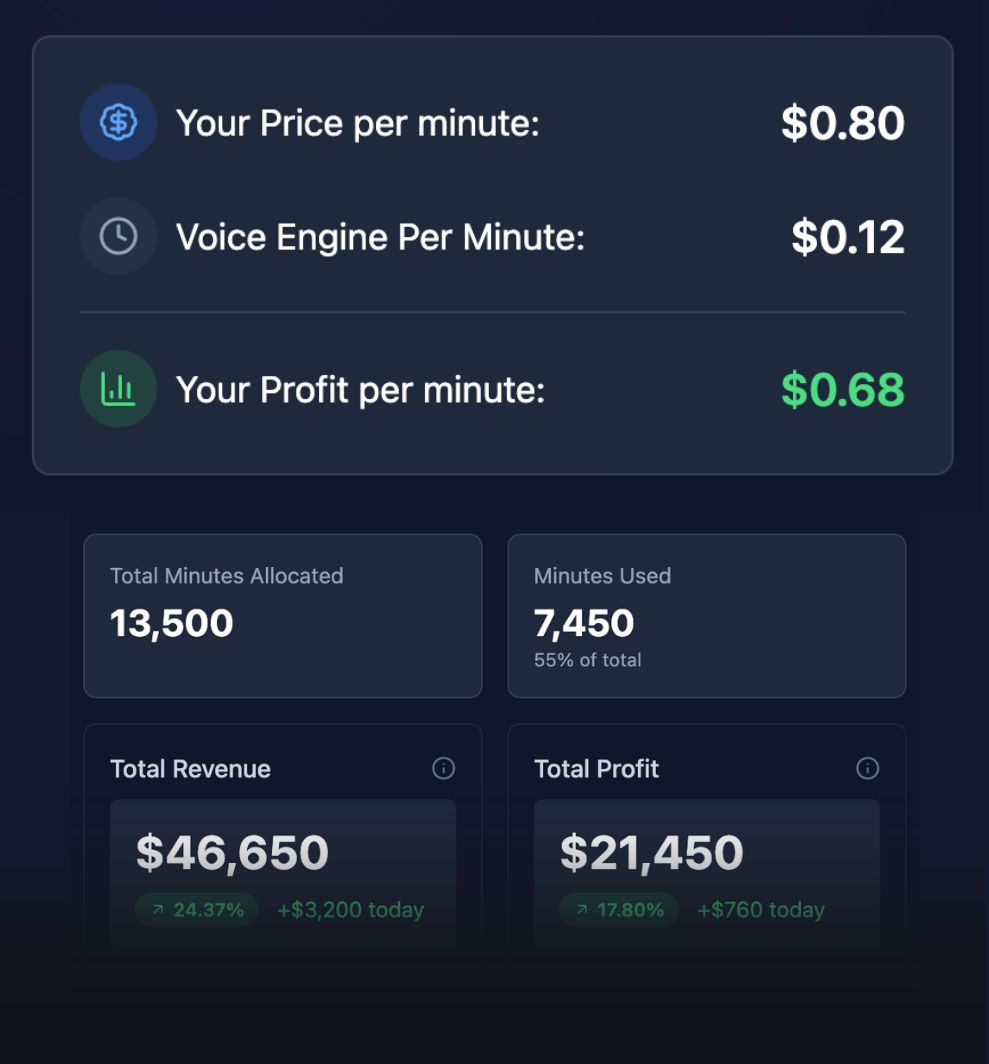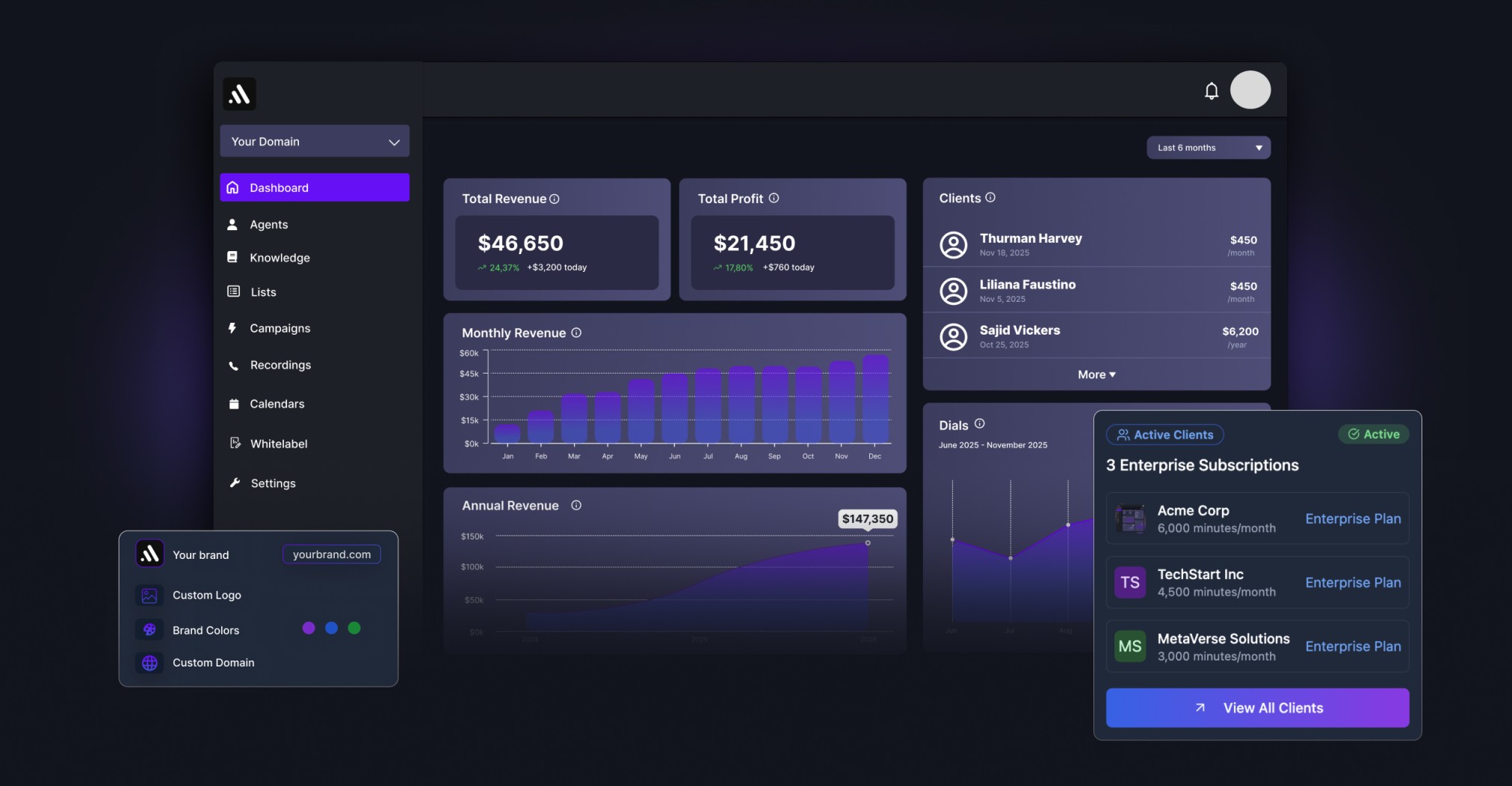 The Whitelabel plan includes full access to the Awaz platform, branding under your domain, client management tools, unlimited agents and sub-accounts, payment integration, and the ability to set your own pricing. You also get access to integrations like Twilio, Sendgrid, OpenAI, and Retell.